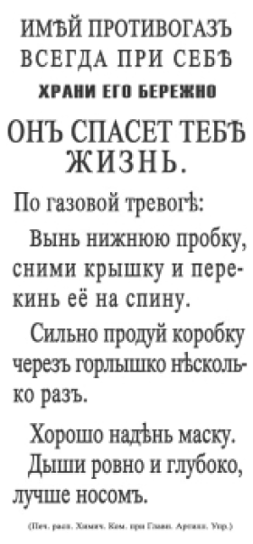 50 граммов размельчённого на мелкие кусочки активированного берёзового угля, плотно прижав платок ко рту и носу и закрыв при этом глаза, смог пробыть в отравленной хлором и фосгеном атмосфере, вдыхая и выдыхая через платок, несколько минут..